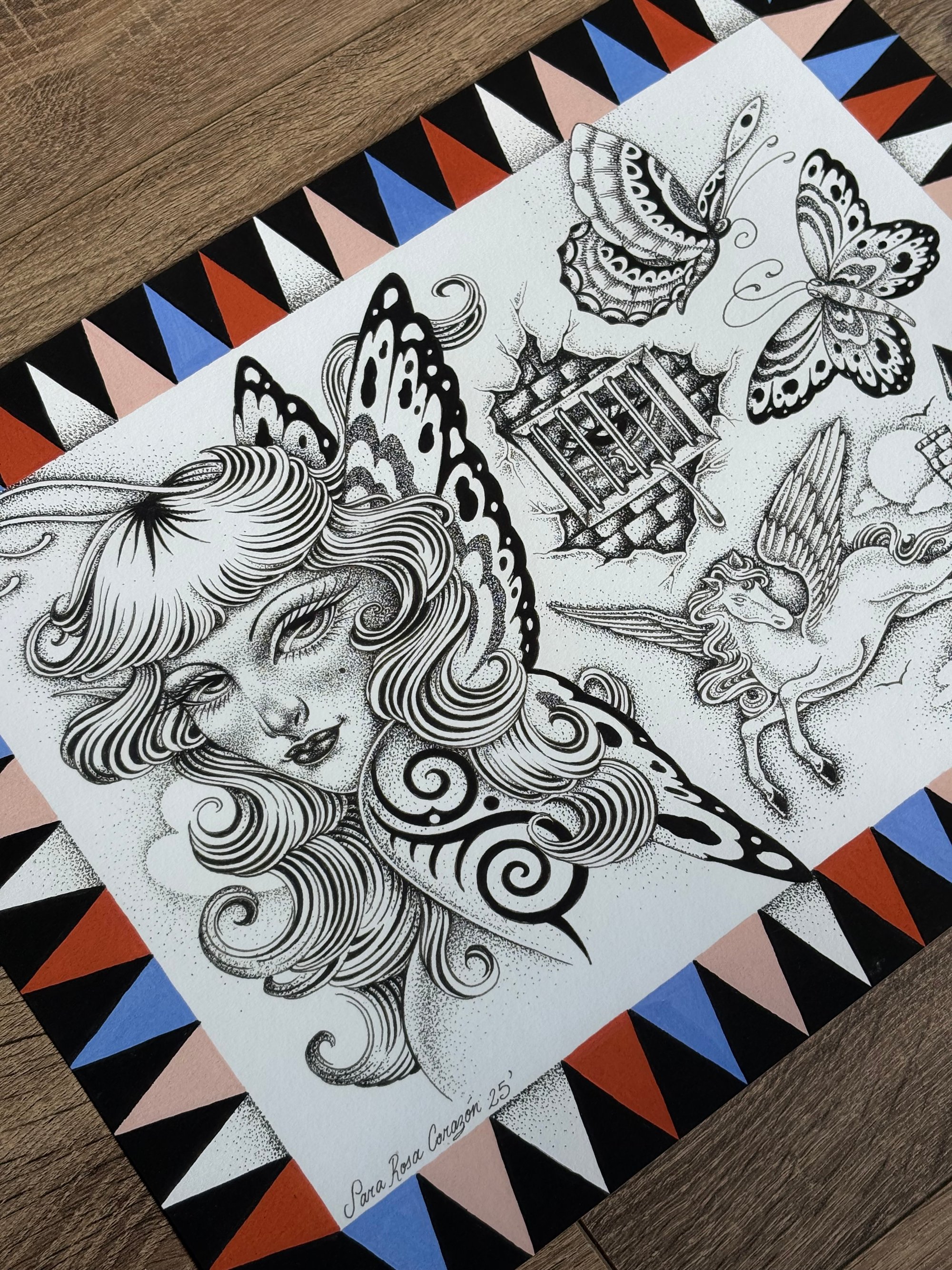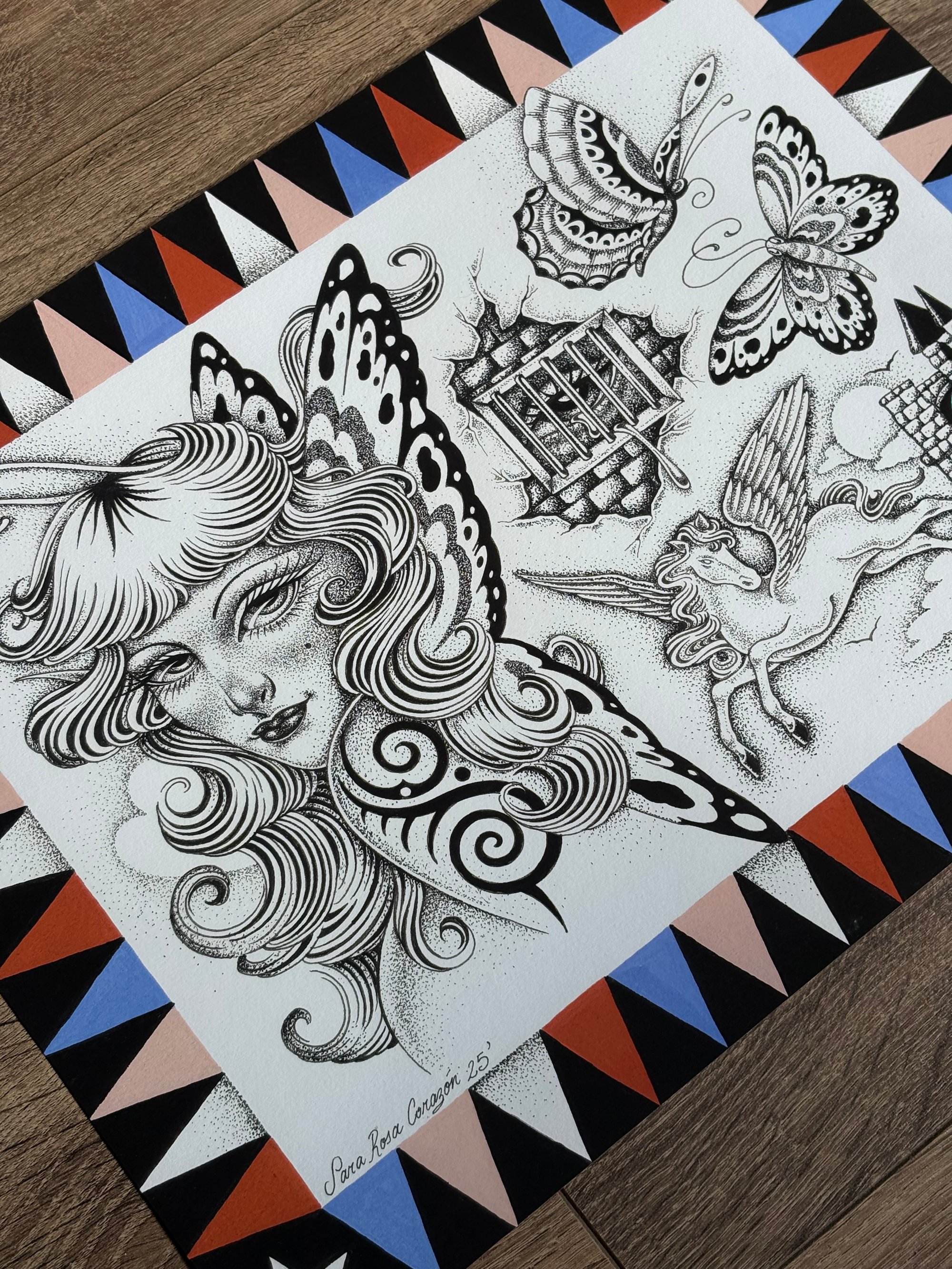 Obra original pintada sobre papel Arches® acuarela grano satinado (300 g/m², 100% algodón). Técnica mixta: acrílicos y bolígrafos micron. Cada pieza fue sellada a mano con barniz marino Titan Yate, lo que le aporta un acabado satinado y gran durabilidad.